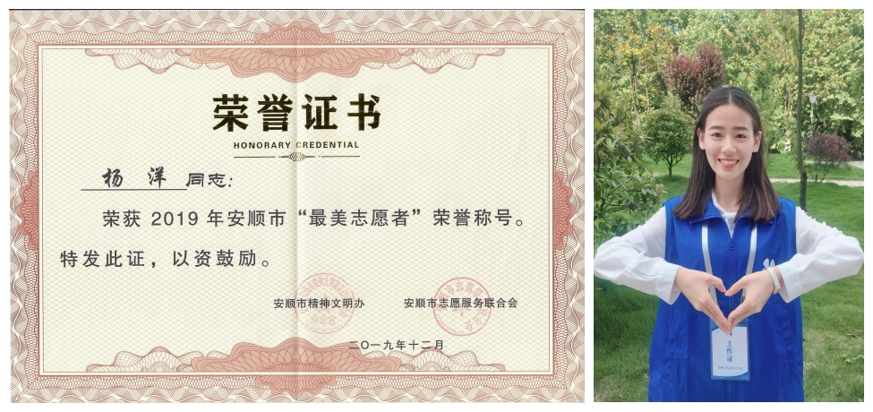 12月5日,安顺市举行2019年“最美志愿者、最佳志愿服务项目、最佳志愿服务组织、最美志愿服务社区”授奖仪式。我校人文学院2017级汉语言文学班学生杨洋被授予“最美志愿者”荣誉称号。