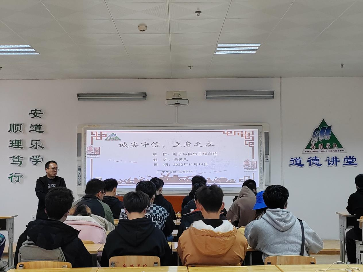为了弘扬中华传统美德,引导同学们树立诚实守信的思想观念。11月14日1下午,安顺学院道德讲堂开展“崇智求真,诚实守信”专题讲座。电子与信息工程学院教务科科长杨秀凡主讲,电子与信息工程学院的同学聆听学习。