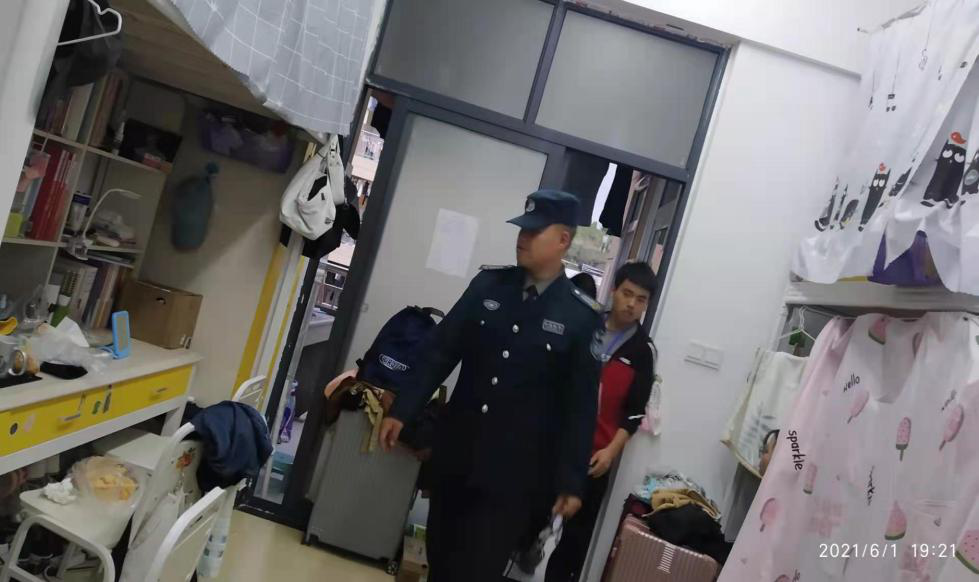 18时30分,队员们准时戴好工作牌到新教楼下整队集合,准备工作基本完成过后,全队排查成员与保卫处工作人员一同前往学生寝室进行检查。