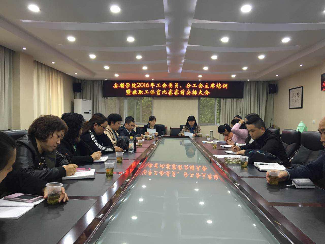 4月29日上午,校工会在行政楼二楼会议室召开安顺学院2016年工会委员、分工会主席培训暨教职工体育比赛赛前安排大会,工会委员、各分工会主席和工会全体成员参加本次会议。会议由工会主席史贤琴主持。