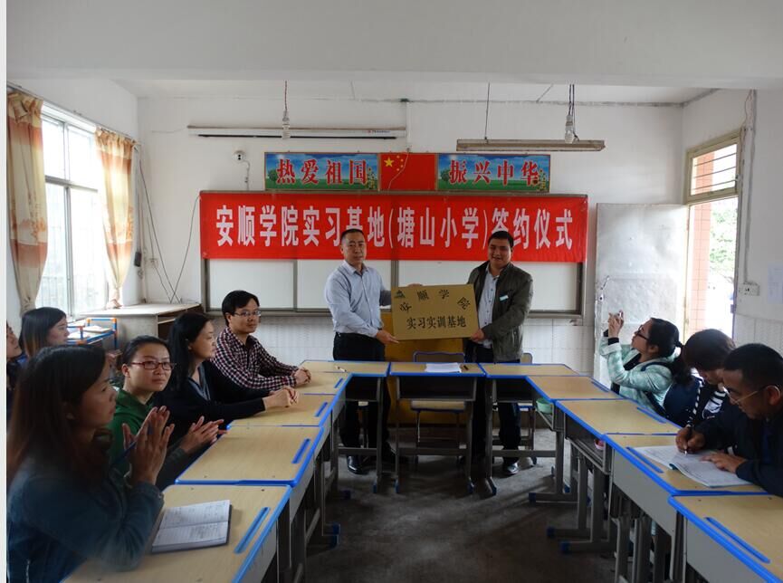 2016年4月13日,教育科学学院院长刘昌友、党总支书记师文慧、副院长邱天龙、学生科科长郭雯一行到安顺市西秀区双堡镇塘山小学代表安顺学院与塘山小学签订实习实训基地建设协议并授牌,并开展了留守儿童心理关爱活动。