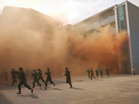 随后,在学校保卫部门和军训团团部有关人员相互配合,同学们进行了模拟火灾逃生条件下的消防演练。随着火灾警报的拉响,集结地烟雾迅速由淡转浓,学生们用毛巾捂住口鼻,快速有序地完成从教室撤离的动作。(图/文 武装部)