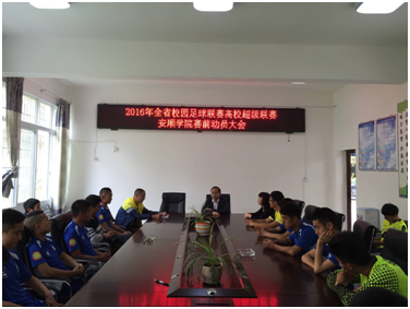 2016年4月7日下午,2016年全省校园足球联赛高校超级联赛安顺学院赛前动员大会在体育学院会议室召开。安顺学院党委书记罗荣彬出席会议并作动员讲话。体育学院院长邓文红、男子足球队领队雷蕾、主教练张弛、助理教练韦训及全体队员参加会议。会议由大学公共体育教学部主任、体育学院院长邓文红主持。