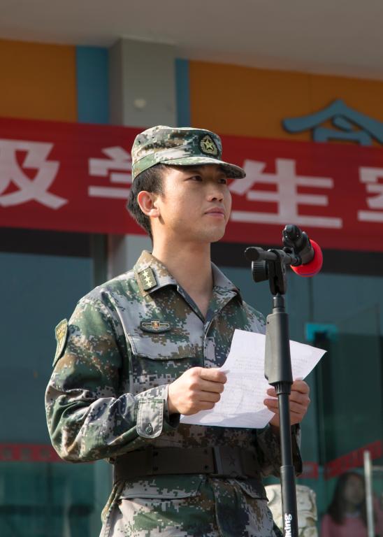 受训学员代表陈星作发言,承诺在军训期间,同学们一定会服从教官安排、听从教官指挥,刻苦训练,把自己锻炼成一个有纪律有组织的当代青年。教官代表王益彪作发言,表示在接下来的十天里会履行好自己的军训职责,让参训学员成为一个合格的、纪律严明的新时代学生。
