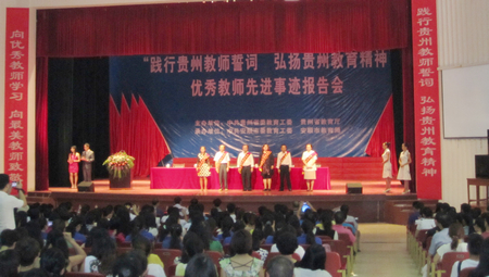 师生们观看了优秀教师代表事迹短片;重温了《贵州教师誓词》并集体宣誓;听取了贵州师范大学杨芳老师、息烽温泉小学刘正国老师、毕节特殊教育学校谢洪琰老师、瓮安中等职业技术中学张应洪老师等优秀教师感人事迹的巡讲。