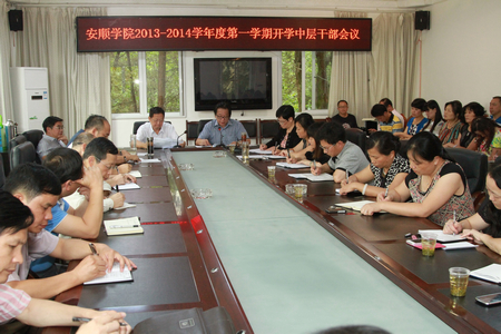 2013年8月19日下午,安顺学院2013—2014学年第一学期中层干部会议在学校行政办公楼会议室召开。会议回顾总结了上学期各项工作,并就新学期工作进行安排部署。安顺学院党委书记李彦西教授、院长李建军教授、副院长熊国敏教授、纪委书记王之瑞、副院长王芳恒教授、副院长令狐荣涛教授以及全校正处级干部参加会议。会议由熊国敏副院长主持。