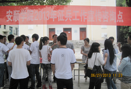 6月27日上午,2013年征兵宣传咨询活动在学校大礼堂前举行。本次活动由我校武装部和安顺市西秀区武装部共同举办。学院副院长令狐荣涛,学工部副部长潘发义,西秀区武装部政委张泽斌、副部长文小平,以及学生工作部、西秀区武装部相关人员参加了此次活动。