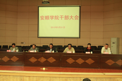 2013年5月31日上午,安顺学院干部大会在学术报告厅举行,会议的任务有两项,一是传达省委十一届三次全会、全省党风廉政警示教育大会、省教育厅行风建设视频会议、市委第63次常委会议精神;二是启动安顺学院第二轮处级干部竞聘上岗工作。参加大会的有学校党委成员,全校副科级以上干部。市委组织部副部长吴景林受市委常委、市委组织部部长赵贡桥的委托出席大会并作讲话,市委组织部干部三科副科长石玉出席大会。