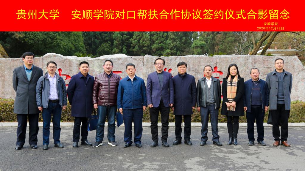 2020年12月28日下午,贵州大学与安顺学院对口合作协议签约仪式在安顺学院行政楼二楼会议室举行。贵州大学党委书记李建军、副校长李军旗;安顺学院校长陈云坤、党委副书记陶文彩,纪委书记、监察专员蔡红英,副校长张来出席签约仪式。签约仪式由陶文彩副书记主持。