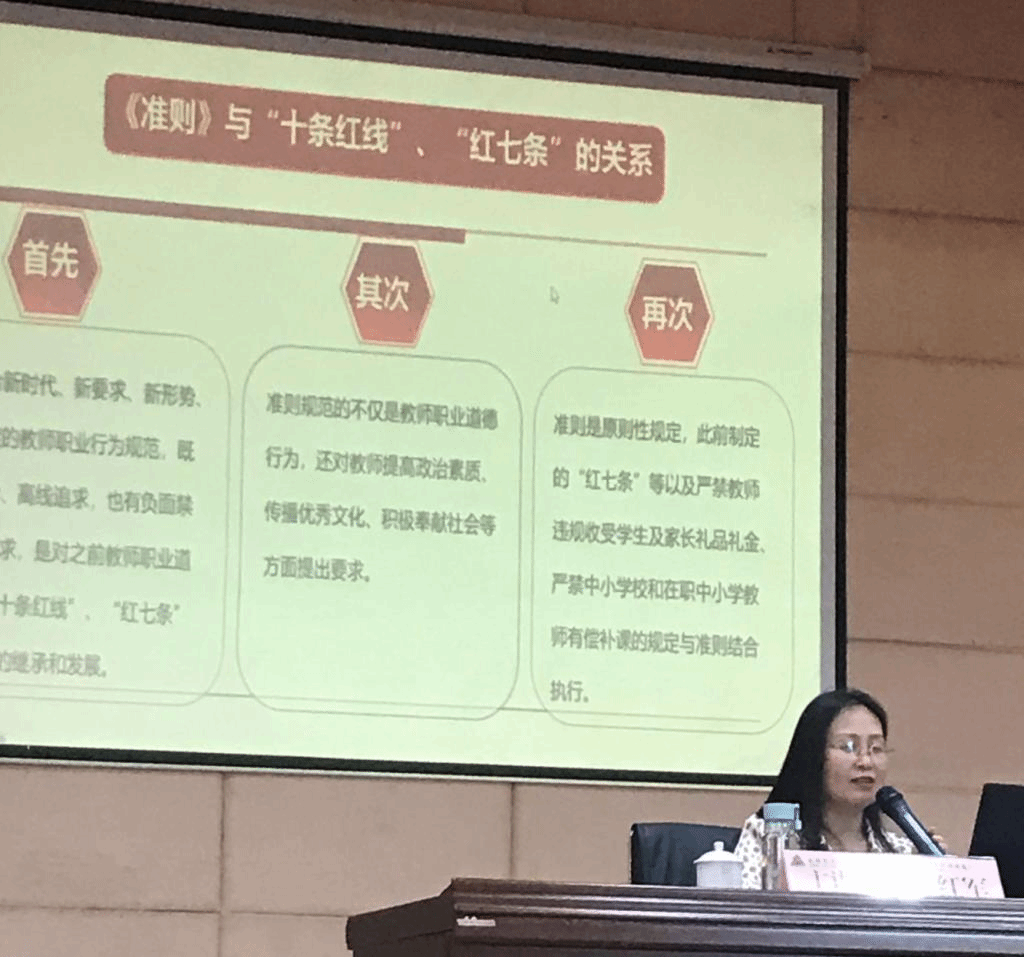 培训结束,韦英作总结发言,她向全校教师提出三点要求:第一,切实加强师德师风建设,坚定理想信念。教师肩负着推进建设教育强国的重任,广大教师必须以培养担当民族复兴大任的时代新人为着眼点,牢固树立中国特色社会主义共同理想,带头践行社会主义核心价值观,不断将立德树人、教书育人的责任感与使命感内化于心、外化于行,为莘莘学子把好人生的“总开关”,扣好人生的第一颗“扣子”,为实现大学生的青春梦与中国梦贡献智慧与力量。第二,切实加强师德师风建设,培育教育情操。一个有教育情操的好老师,要把“敬业爱生”作为自身工作的准则,增强教书育人的责任感和使命感,不断强化师德修养的自觉性,要坚持不断弘扬社会主义核心价值观和中华传统美德,以高尚纯粹的品格、知行合一的精神、渊博扎实的学识等引领学生把握好人生的方向。第三,切实加强师德师风建设,形成教育规范。对于教师而言,“德”是评价的第一标准。加强师德师风建设,要求广大教师铭记自身使命,全面理解和准确把握十项准则要求,增强遵守准则的思想自觉和行动自觉。师德师风建设永远在路上,任何时候都不能放松,只有时刻自重、自省、自警、自励,在教书育人实践中不断涵养高尚师德,以德立身、以德立学、以德施教,通过法治教育、警示教育、日常教育督导等,强化事前预防,引导广大教师严于律己,严守师德底线,才能做一个无愧于心、无愧于社会的好老师。