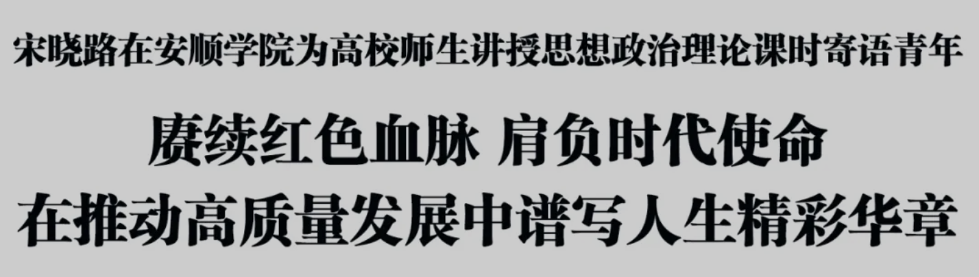 10月15日,市委副书记、市长宋晓路到安顺学院为安顺学院师生讲授思想政治理论课、开展党史学习教育,与大家一起重温习近平总书记“七一”重要讲话精神,从百年党史中汲取奋进力量,走好新时代的长征路。他寄语广大青年,要深入学习贯彻习近平总书记“七一”重要讲话精神,牢记习近平总书记殷切嘱托,赓续红色血脉,肩负时代使命,在实现中华民族伟大复兴的征程中、推进安顺高质量发展的实践中书写人生华章。