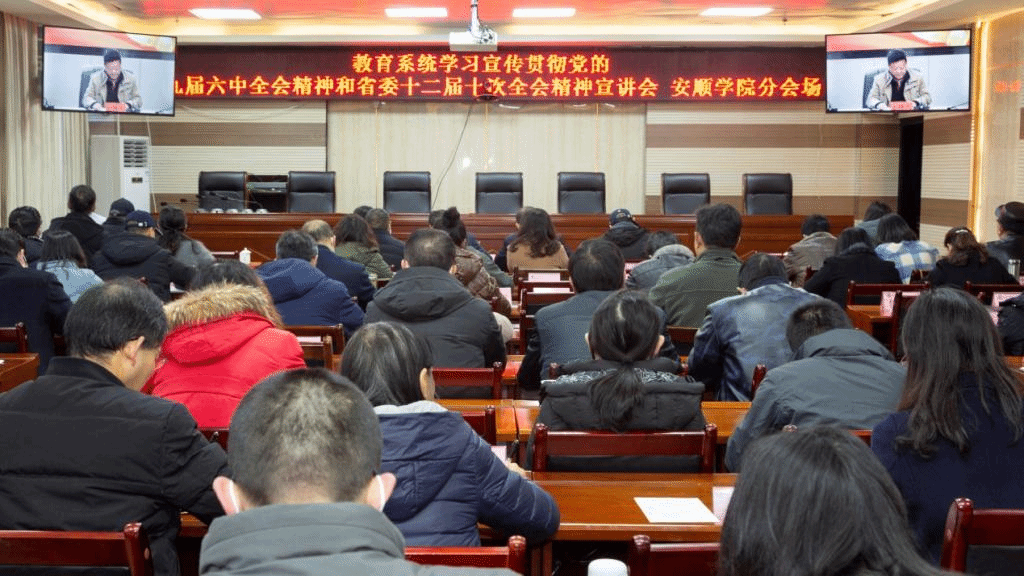 12月15日上午,安顺学院设分会场组织参加教育系统学习宣传贯彻党的十九届六中全会精神和省委十二届十次全会精神宣讲会,学校领导班子成员、全体处级干部参会。