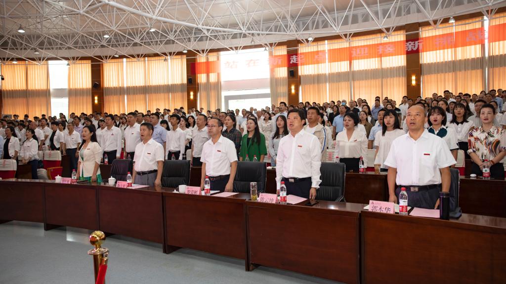 伴随着庄严的旋律,全体教师起立并齐声高唱《中华人民共和国国歌》。