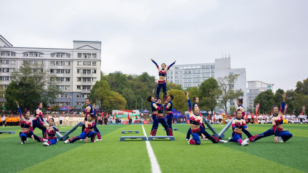 之后,广播体操队员们精神饱满,热情高涨,认真投入,用整齐划一的动作,端庄秀丽的姿态揭开精彩的文艺表演。在铿锵锣鼓声中,首蒙青巾,腰围战裙,戴脸子于额前,手执戈矛刀戟之属的展演者用急如瀑雨,畅若飞燕的身姿再现金戈铁马的征战故事,再现被誉为“中国戏剧活化石”的安顺地戏。充满活力的踏板操激情律动,健身气功《八段锦》集国术精华之集如锦缎般柔顺。舞龙表演《龙腾盛世》将文艺表演再次推向高潮。