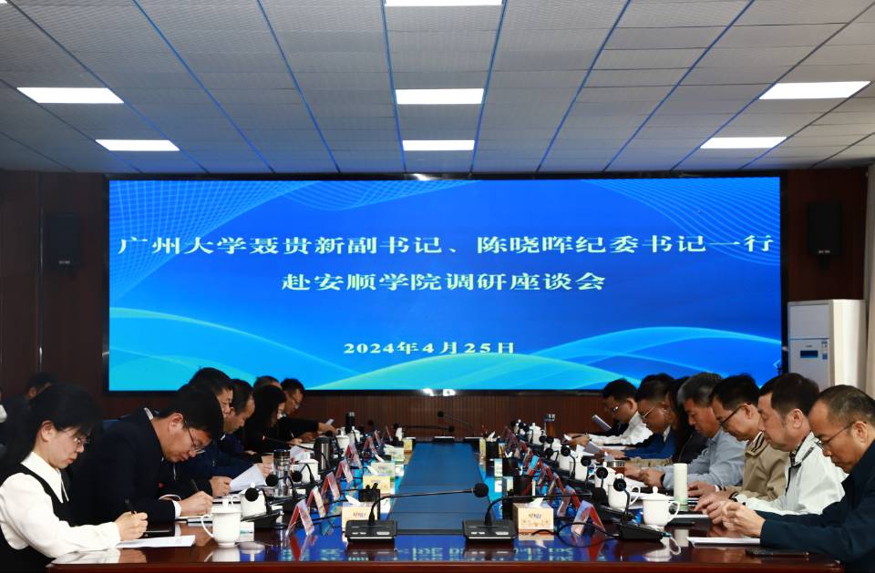 4月25日,广州大学党委副书记聂贵新一行到安顺学院进行调研,广州大学党委常委、纪委书记陈晓晖,广州大学党委常委、统战部长卢捷,及有关部门学院负责人参加调研交流。安顺学院党委书记罗荣彬,校长曾丽,党委副书记陶文彩,党委委员、纪委书记、监察专员蔡红英,副校长张来及相关职能部门负责人陪同调研。
