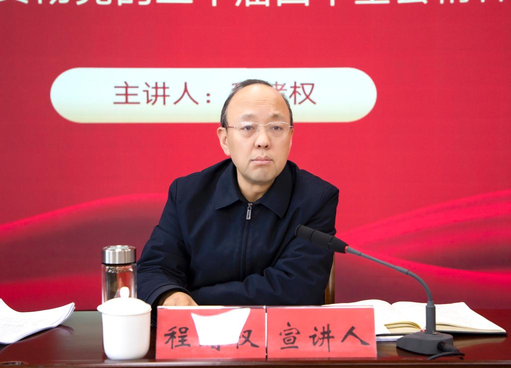 程绪权指出,此次宣讲报告会的主要任务是:深入学习领会全会的重大意义、核心要义和实践要求,切实把全校师生的思想和行动统一到党中央决策部署上来,将学习贯彻全会精神与落实学校第三次党员代表大会精神紧密结合,凝心聚力,抢抓机遇,勇担使命,奋力开创建设文旅融通特色鲜明的高水平应用型大学新局面。