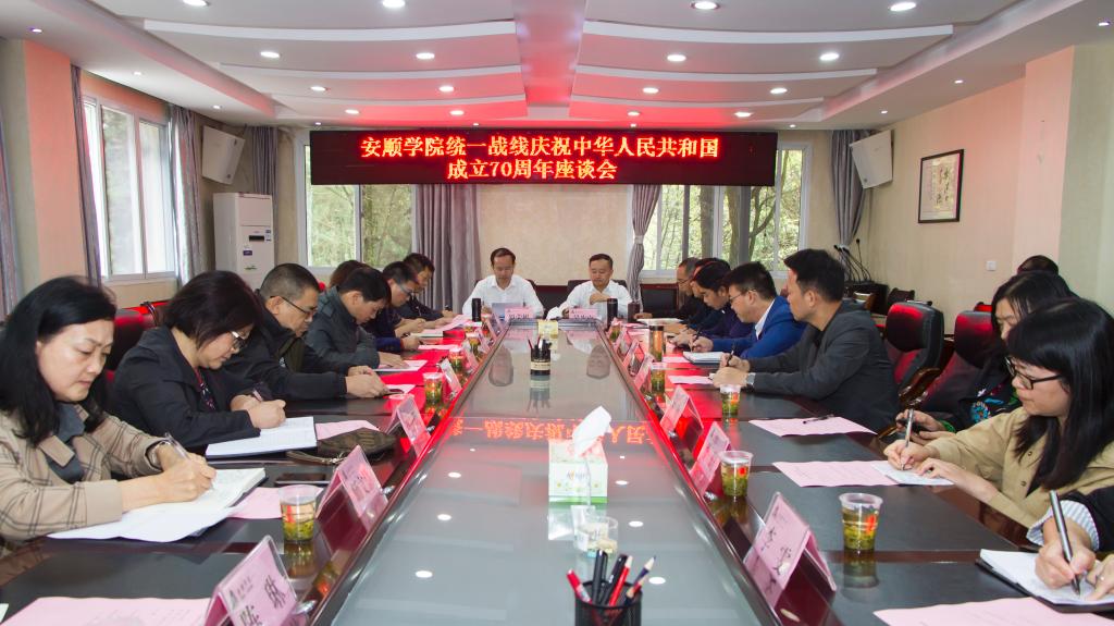 9月20日上午,安顺学院统一战线庆祝中华人民共和国成立70周年座谈会在学校会议室召开。安顺学院党委书记罗荣彬、校长吴次南、党委副书记陶文彩出席会议。安顺学院民革、民盟、九三学社、致公党、农工民主党、无党派人士、安顺市政协委员、西秀区政协委员、侨联、留联会、知联会、台属代表及相关职能部门负责人参加座谈会。会议由学校党委书记罗荣彬主持。