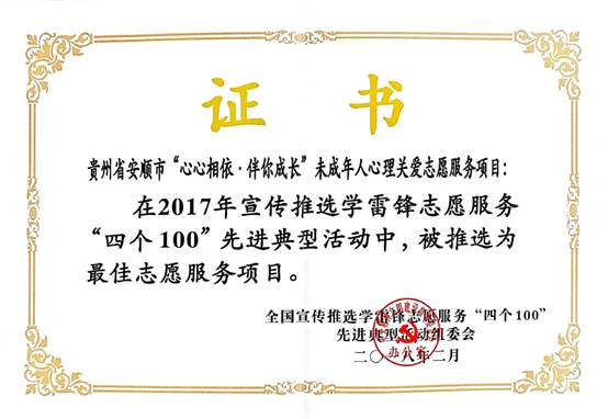 (5)主持开展的“未成年人心理关爱”项目,2015、2016年被评为安顺市最佳志愿服务项目;