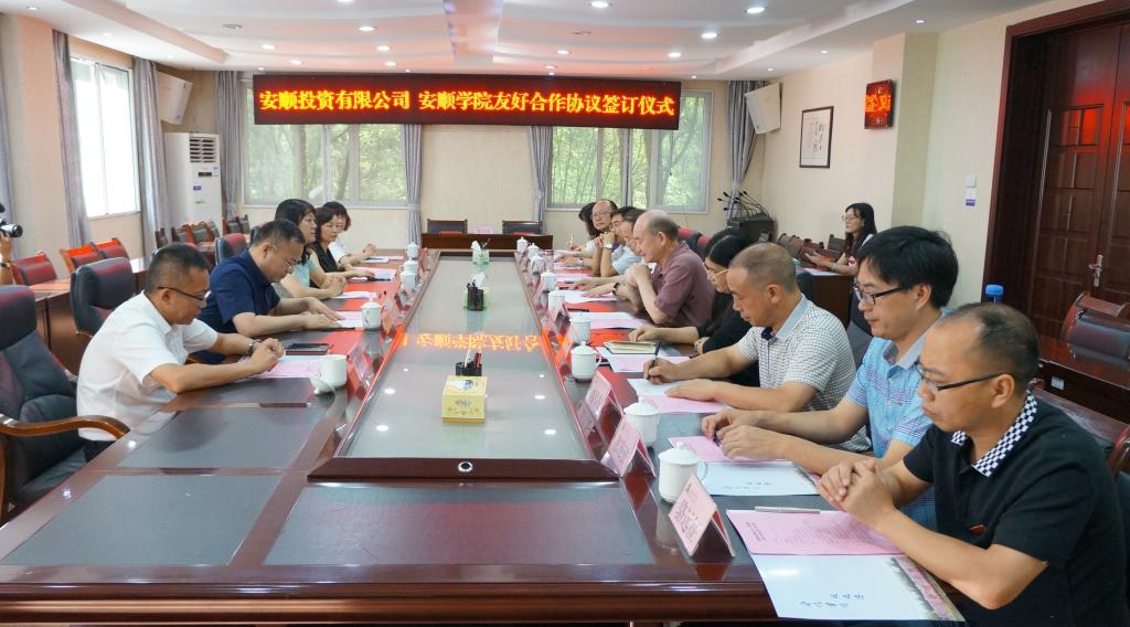2018年7月4日,安顺学院与安顺投资有限公司友好合作协议签订仪式在行政办公楼二楼会议室举行。学院党委书记罗荣彬,院长刘雷,副院长王芳恒,安顺投资有限公司董事长李英,总经理罗丽萍,副董事长李家伟,董事长助理、人力资源部经理罗传英,安顺旅游投资公司副总经理朱海涛,安顺学院党政办主任兼经济与管理学院党总支书记韦英,发展规划处处长刘昌友,教务处处长李琳,教务处副处长郑海波及部分工作人员参加座谈。罗荣彬书记主持座谈并讲话。