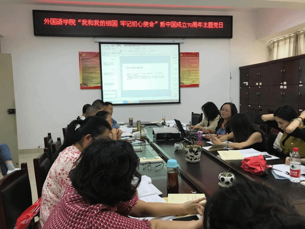 2019年9月29日下午,安顺学院外国语学院党委组织全体教师党员在外国语学院党员活动室开展“我和我的祖国·牢记初心使命”主题党日活动,旨在学习贯彻习近平新时代中国特色社会主义思想,深入开展“不忘初心、牢记使命”主题教育,热烈庆祝新中国成立70周年。外国语学院党委副书记刘碧芬同志主持本次活动,外国语学院教师党支部全体党员参加此次活动。