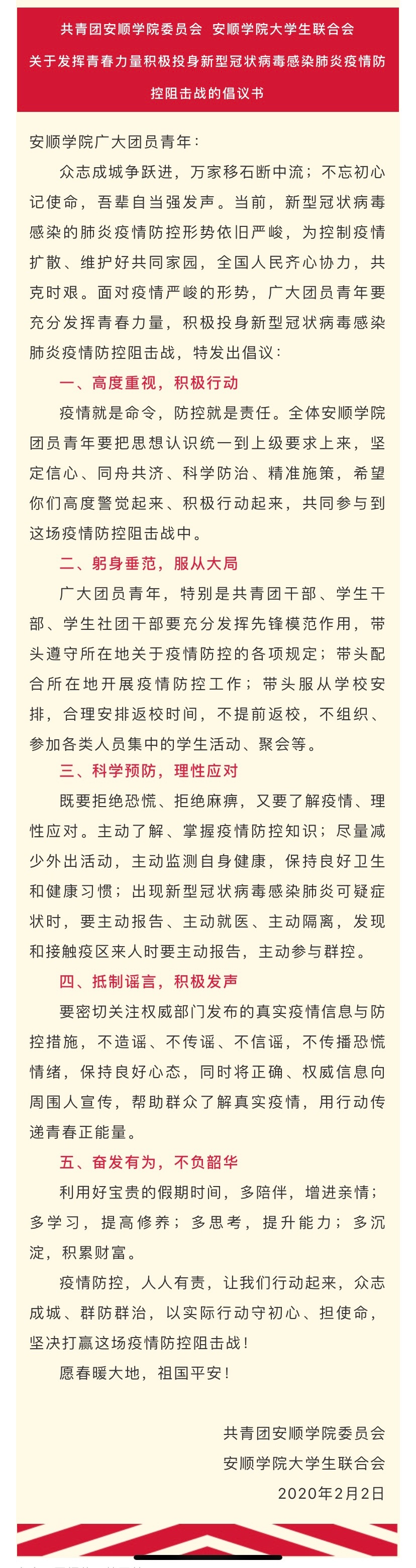 三是发出防疫倡议。共青团安顺学院委员会、安顺学院大学生联合会联合向全校广大青年团员发出《关于发挥青春力量积极投身新型冠状病毒感染肺炎疫情防控阻击战的倡议书》,号召广大团员青年要充分发挥青春力量,积极投身新型冠状病毒感染肺炎疫情防控阻击战。