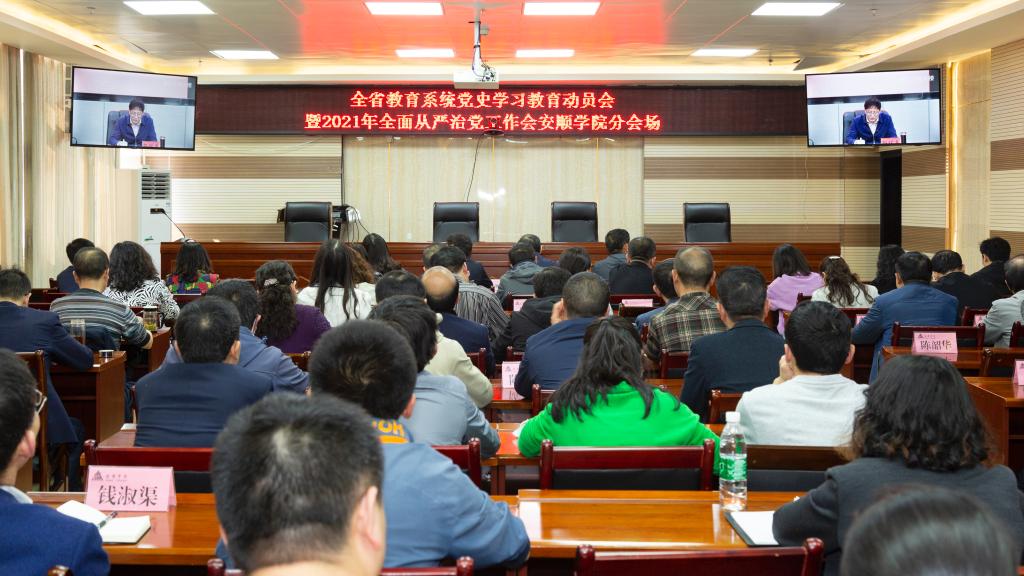 2021年3月19日,贵州省教育系统党史学习教育动员会暨2021年全面从严治党工作会议召开,动员部署全省教育系统党史学习教育,安排部署2021年全省教育系统全面从严治党工作。安顺学院党委书记罗荣彬、校长陈云坤、党委副书记陶文彩及全校中层干部在安顺学院特教大楼七楼会议室分会场参加。