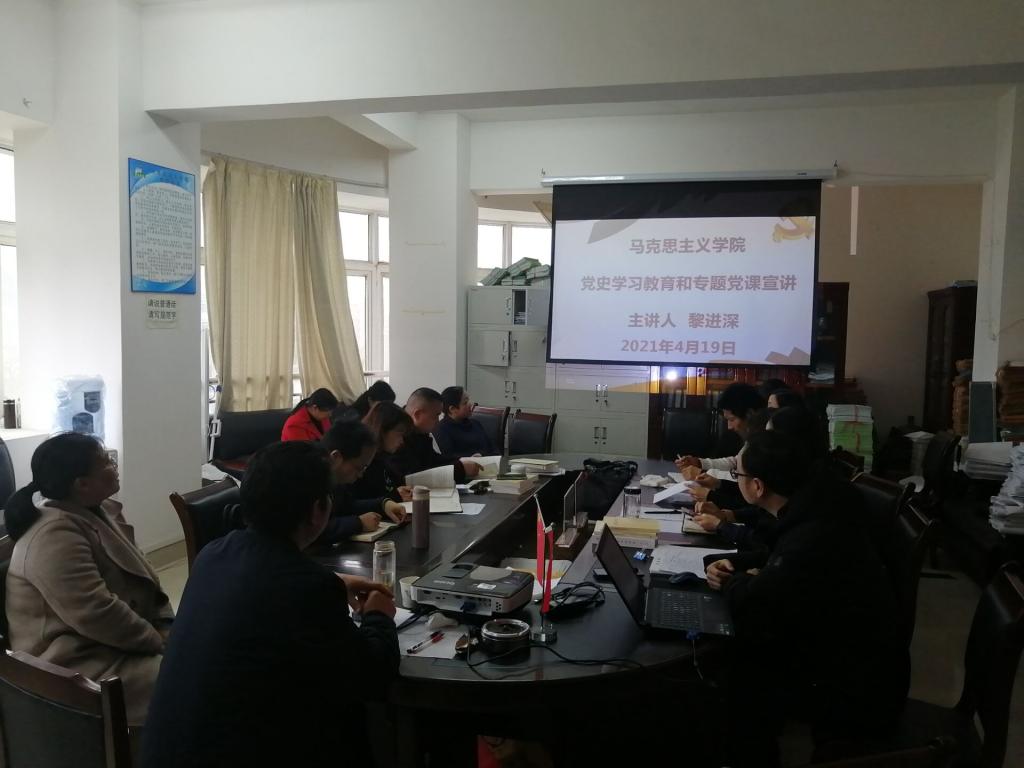 为深入学习贯彻习近平总书记在党史学习教育动员大会上的重要讲话精神,扎实有效开展党史学习教育,2021年4月19日下午,马克思主义学院开展党史学习教育和专题党课宣讲活动,此次活动由学院院长黎进深同志主讲,全体党员教师聆听了专题党课。