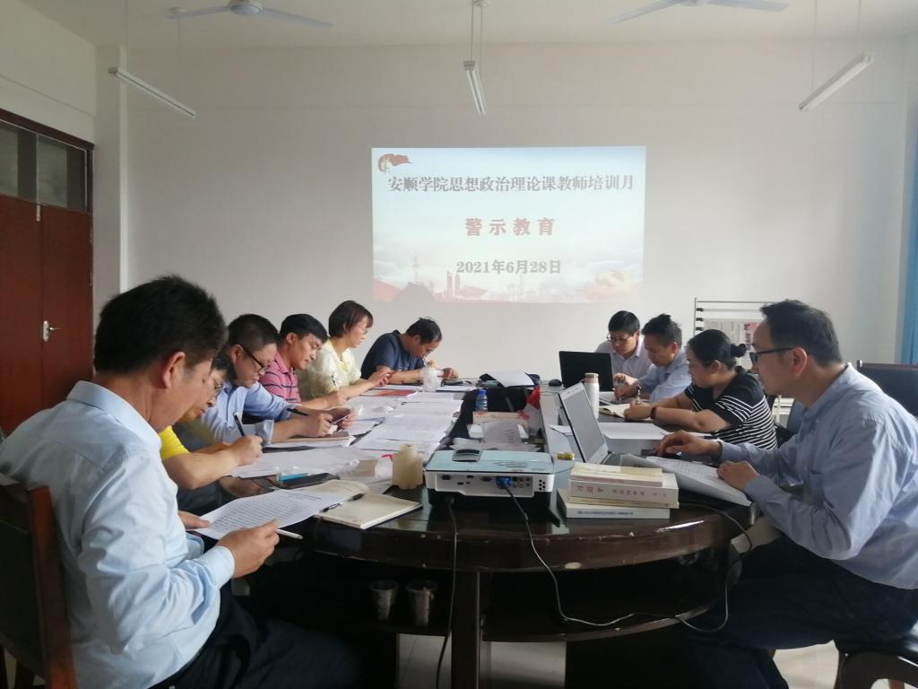 2021年6月28日,安顺学院思想政治理论课教师在马克思主义学院会议室开展党史学习教育暨“牢记殷切嘱托、忠诚干净担当、喜迎建党百年”专题教育培训月警示教育活动。会议由马克思主义学院党委书记王罡主持,全体专兼职思政课教师参加了会议。