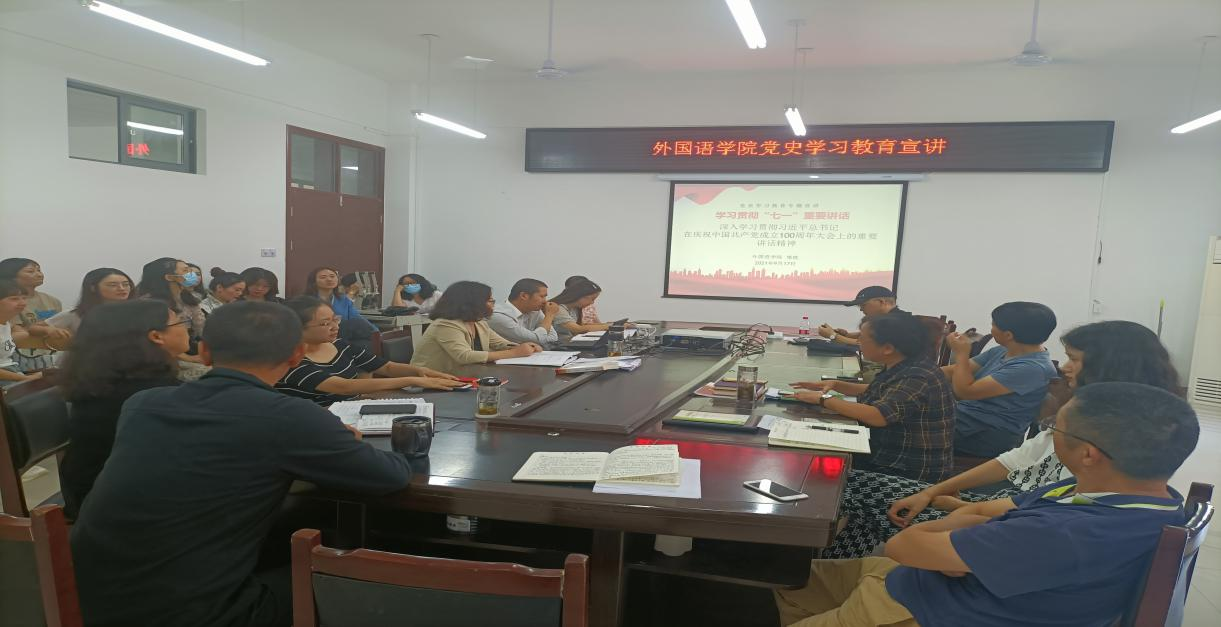 2021年9月17日下午,大外部副主任、教师党支部书记柴能以“深入学习贯彻习近平总书记在庆祝中国共产党成立100周年大会上的重要讲话精神”为题,为外国语学院全体教职工进行了党史学习教育专题宣讲。