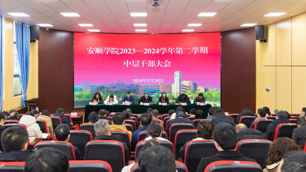 2024年2月28日上午,安顺学院2023-2024学年度第二学期中层干部大会在安道楼二楼阶梯教室召开。安顺学院校领导,全体正、副处级干部参加会议。会议由安顺学院党委副书记陶文彩主持。