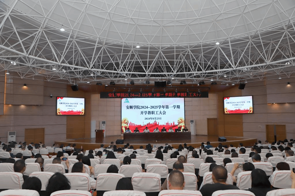 2024年8月23日下午,安顺学院2024-2025学年度第一学期开学教职工大会在学术报告厅召开。安顺学院党委书记罗荣彬、校长曾丽就做好新学期各项工作进行部署,要求具体、目标明确。会议由安顺学院党委副书记陶文彩主持。