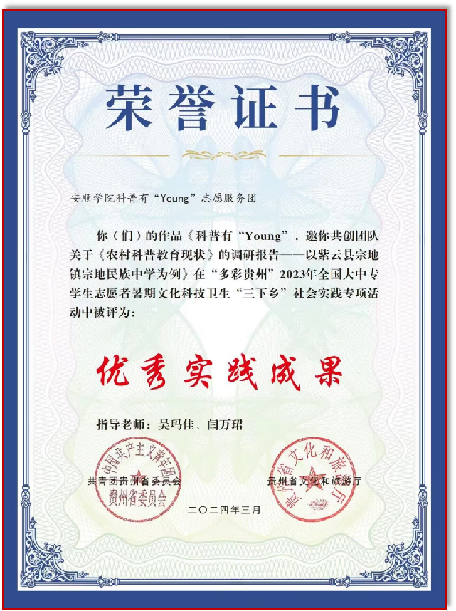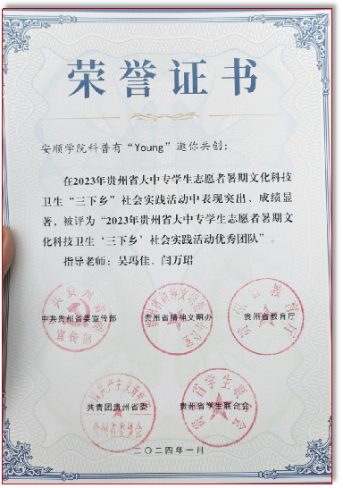 学院大力开展社会实践活动,鼓励学生走出校园、服务社会。组织学生参与各类志愿服务活动,如全球青少年人工智能普及活动、安顺市青少年等级考试、安顺市青少年机器人竞赛等志愿服务;组织学生到中学开展科普课程讲授、科技竞赛指导等工作;围绕科普教育开展暑期“三下乡”社会实践活动。近三年,有近百名学生参与科普教育相关的志愿者服务;有30名大学生参与中学科普教育,服务中学生500人;科普有“Young”志愿服务团在“多彩贵州”2023年全国大中专学生志愿者暑期文化科技卫生“三下乡”社会实践专项活动中被评为贵州省优秀实践成果、优秀团队。