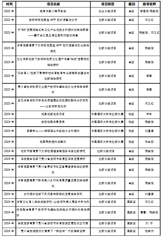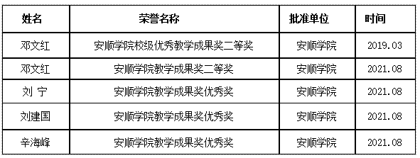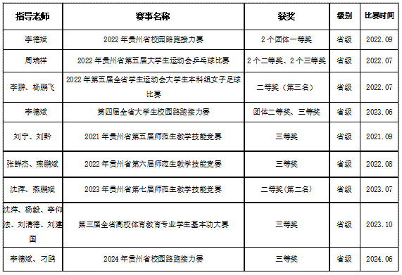 (1)安顺学院双师双能型教师王仁爱获得中华人民共和国第十二届少数民族传统体育运动会射弩项目比赛男子传统弩立姿项目一等奖、标准弩立姿项目二等奖、标准弩混合团体决赛一等奖。