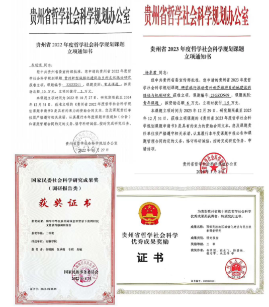 学院高度重视教师科研工作的开展,以科研带动学院学科专业、硕士点建设,服务于学校更名转型发展。近年来,旅游管理专业硕士点建设取得了重大突破,拥有贵州省高校乡村振兴研究中心、屯堡文化研究中心、亚鲁王研究中心、三线文化研究中心等研究中心4个;亦有新型城镇化建设与乡村振兴研究省创新团队,旅游产业创新生态系统研究创新团队等省十大创新团队2个;“贵州省屯堡文化传承与旅游发展2011协同创新中心”“贵州省乡村振兴2011协同创新中心”2个。承担国家级、省部级项目等各级各类项目30余项,横向项目20余项,总经费突破1000万元。发表SCI、SSCI、CSSCI论文10余篇,出版著作20余部。省部级学术成果奖10项。承担政府、企业相关横向项目20余项。咨政报告得到省市领导批示20余件。科研成果综合性强,质量较高。
