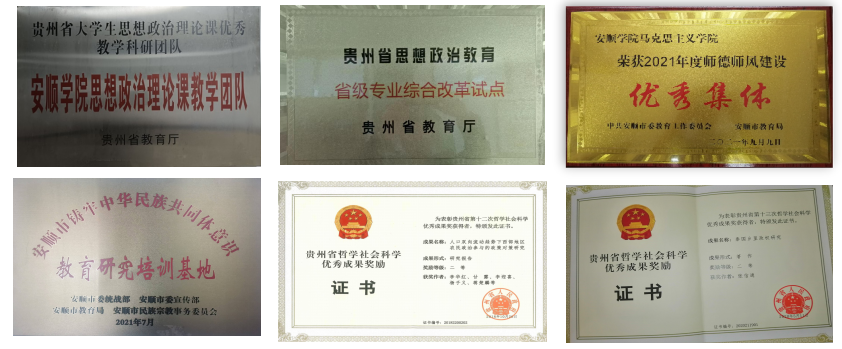 2006年升本以来,马克思主义学院累计获批各级各类科研项目近70余项。其中,国家级项目立项 6项,省部级项目20余项,地厅级及各类项目40余项;实现安顺学院第一个国家社科基金项目、第一个贵州省社科基金重大委托项目、第一个国家社科基金重点项目立项的突破。近年来,获贵州省第十二届哲学社会科学优秀成果二等奖2项;第十三、十四届哲学社会科学优秀成果二等奖1项,三等奖3项;获第四届贵州高校人文社科研究成果一等奖1项。