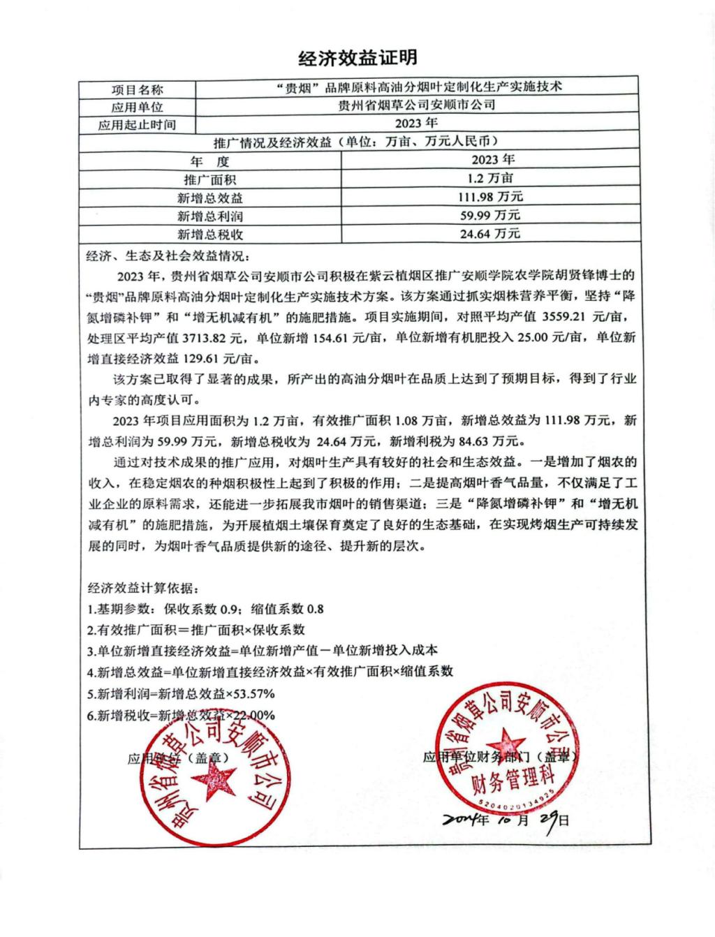 青年教师胡贤锋主持项目《“贵烟”品牌原料高油分烟叶定制化生产实施技术》经贵州省烟草公司认定,2023年新增总效率111.98万元。
