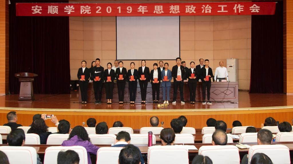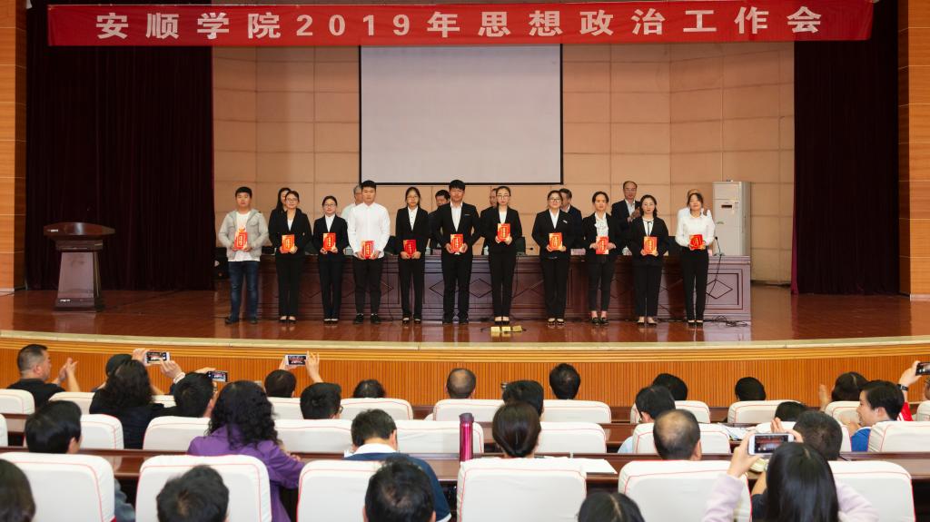 2019年4月29日下午,安顺学院2019年思想政治工作会在学术报告厅隆重召开。安顺学院党委书记罗荣彬,校长吴次南,党委副书记陶文彩,副校长顾名宇、令狐荣涛、郭本华,纪委书记蔡红英,党委各工作部门、大学生思想政治教育工作领导小组和学生工作领导小组各成员部门、各二级学院班子成员,学工部(学生处、武装部)、招就处、学生资助管理中心、团委全体人员,思想政治理论课专职教师,专职组织员,一线专职辅导员、班主任,获奖教师,先进学生集体和优秀学生个人代表,校级学生组织或团体干部代表,各学院团总支、学生会学生干部代表和其他同学代表等参加会议。会议由吴次南校长主持。