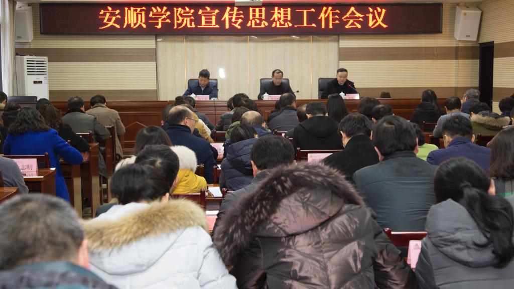 2018年12月19日下午,安顺学院宣传思想工作会议在特教大楼七楼会议室召开。安顺学院党委书记罗荣彬、校长吴次南、党委副书记陶文彩出席会议,安顺学院全校副处级以上干部及宣传部全体成员参加会议。会议由吴次南校长主持。