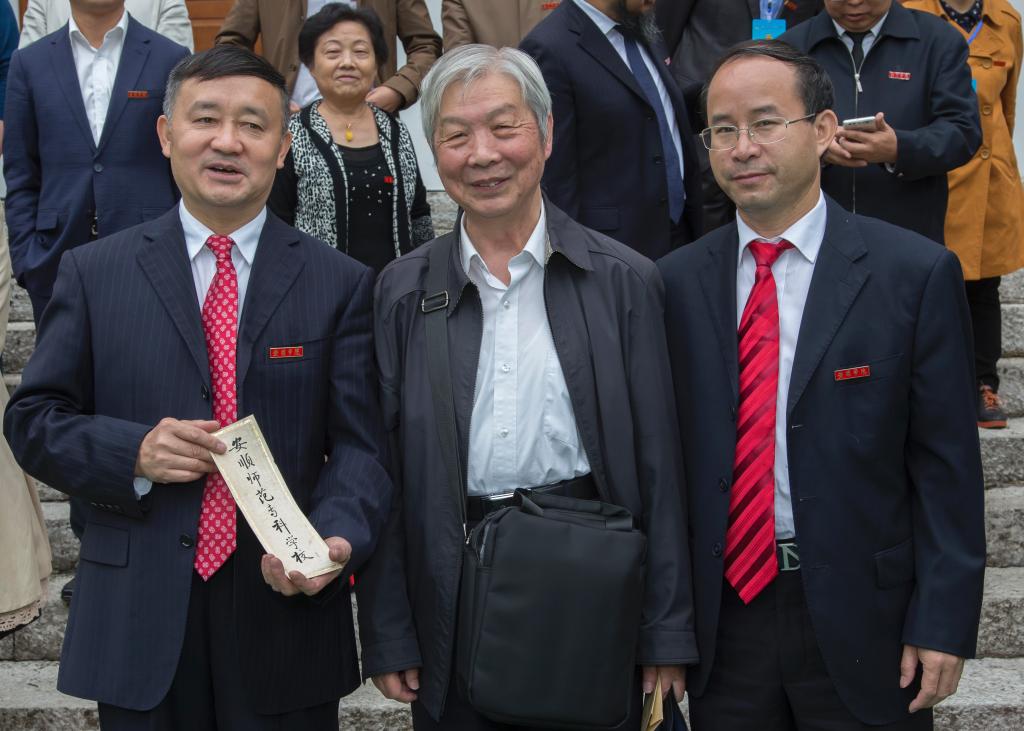 安顺师范专科学校原校长杨和(中)向学校移交由启功先生亲笔题写的“安顺师范专科学校”校名原件