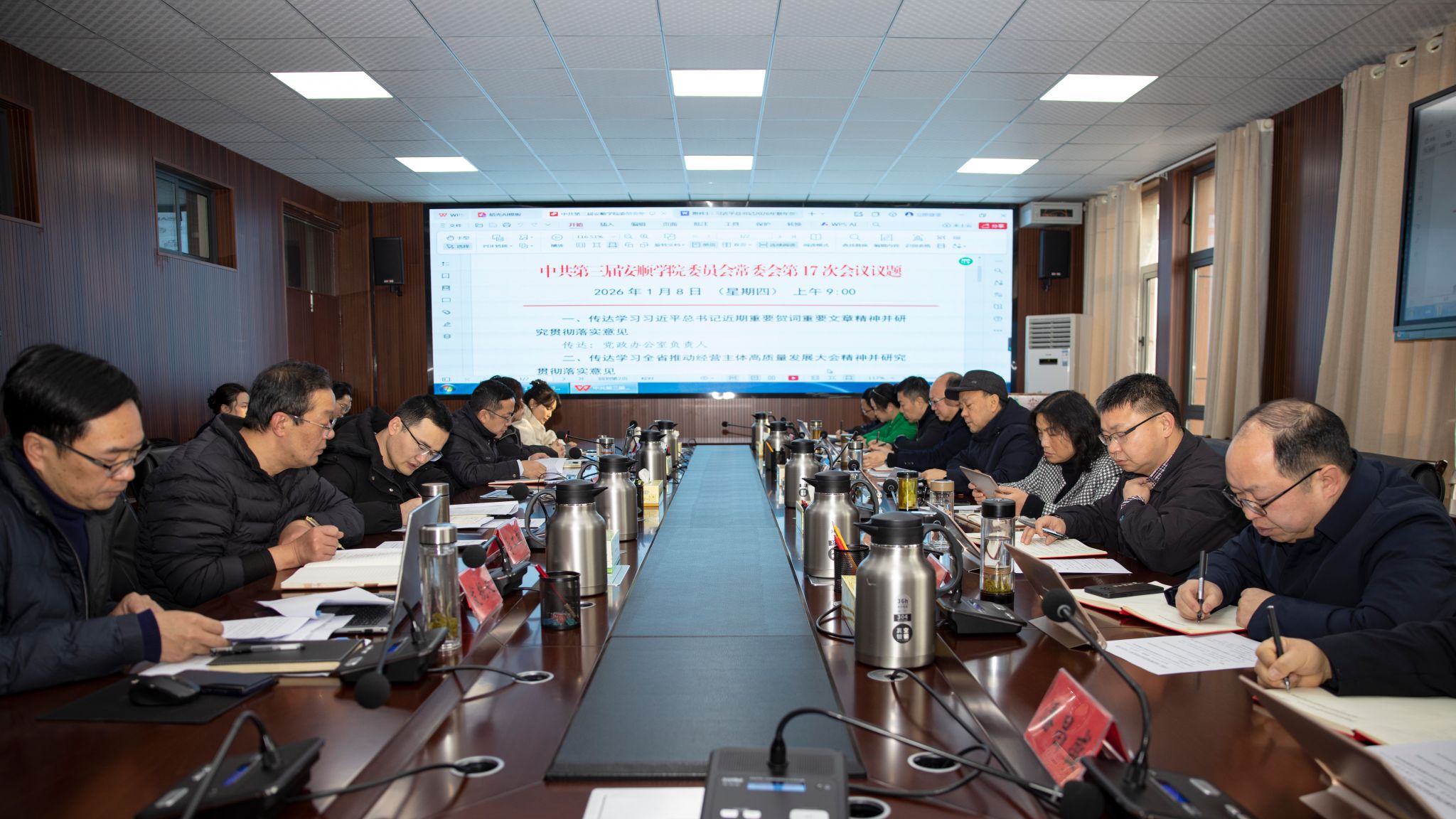 2026年1月8日,安顺学院在安道楼五楼第一会议室召开党委常委(扩大)会议,学习贯彻习近平总书记近期重要贺词、重要文章精神,传达学习全省推动经营主体高质量发展大会精神,研究部署贯彻落实举措。学校党委常委、校领导,列席部门负责人参加会议。校党委书记程绪权主持会议并讲话。