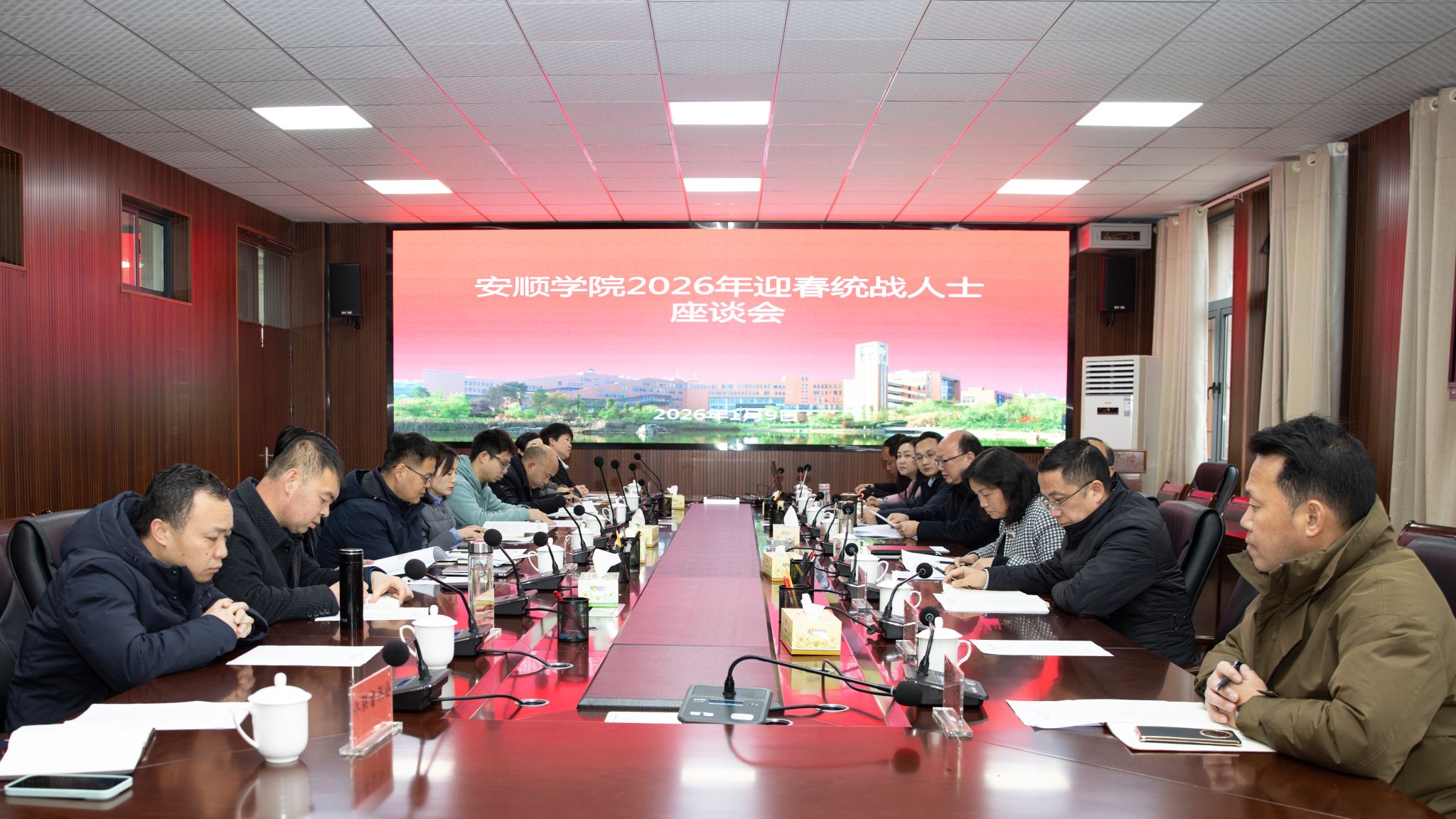 2026年1月9日上午,安顺学院2026年迎春统战人士座谈会在安道楼五楼第一会议室召开。安顺学院校领导,党政办、组织部、宣传部、统战部、机关党委、人事处负责同志,各民主党派、无党派代表人士,学校部分市、区政协委员,侨联、留联会、知联会负责人参加座谈会。安顺学院党委副书记李琳主持会议。