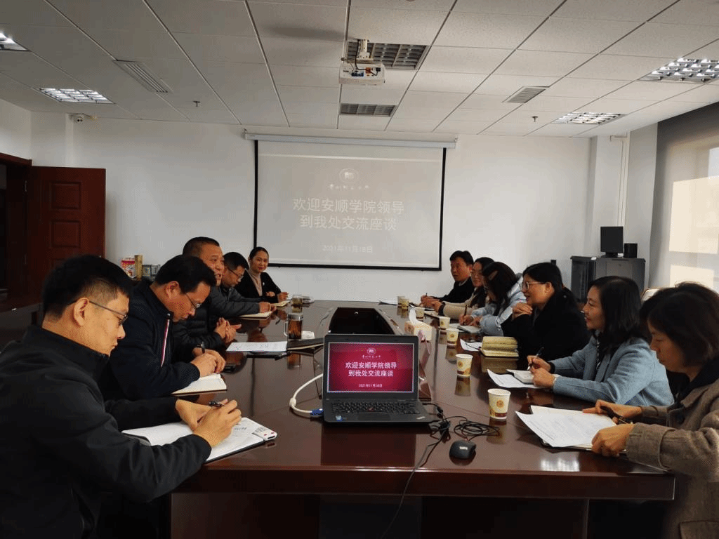 2021年11月18日下午,安顺学院党委委员、副校长韦英率国资处工作团队前往贵州师范大学国有资产管理处交流座谈。贵州师范大学国有资产管理处处长曾雪轶等领导热情接待,带领安顺学院国有资产管理处团队参观了科室建设,开展了“党建与业务如何双融双促”交流座谈。座谈会由贵州师范大学国有资产管理处处长曾雪轶主持。