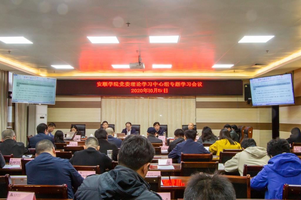 2020年10月5日,安顺学院党委书记罗荣彬主持召开安顺学院党委理论学习中心组专题学习会议,学习《习近平谈治国理政》第三卷有关篇章、《习近平总书记教育重要论述讲义》有关章节;传达学习习近平总书记重要文章《思政课是落实立德树人根本任务的关键课程》、中共贵州省委办公厅 贵州省人民政府办公厅关于印发《贵州省贯彻落实<党政主要负责人履行推进法治建设第一责任人职责规定>实施办法》的通知、《关于印发新冠肺炎疫情防控常态化下治愈患者心理疏导工作方案的通知》。