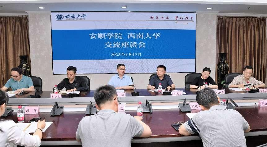 西南大学副校长王志坚在西南大学行署楼A栋会客室主持见面会,并介绍了西南大学基本情况,我校副校长张来介绍安顺学院办学和学科专业建设的基本情况及此行目的,并对西南大学的热情接待表示感谢,会后参观了西南大学校史馆。