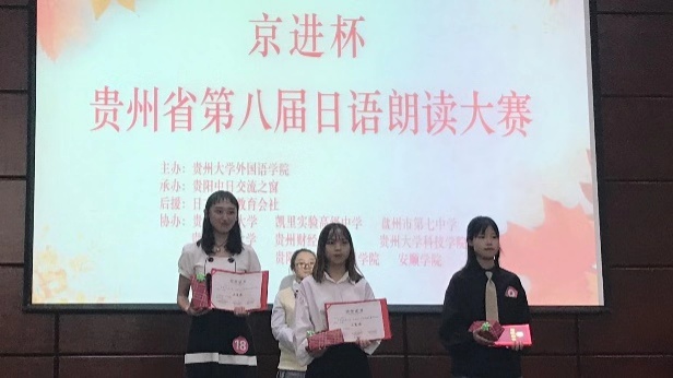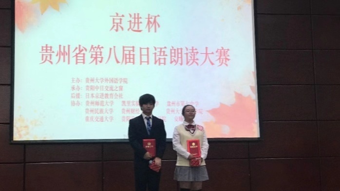 此次比赛分为两部分。上午,来自全省各高校、高中的选手进行了精彩的朗读比赛,我校陈明同学和符开琴同学在脱稿的情况下,以标准的发音和自然的表现力从20名参赛选手中脱颖而出,最终分别获得本次贵州省日语朗读比赛二等奖、三等奖。