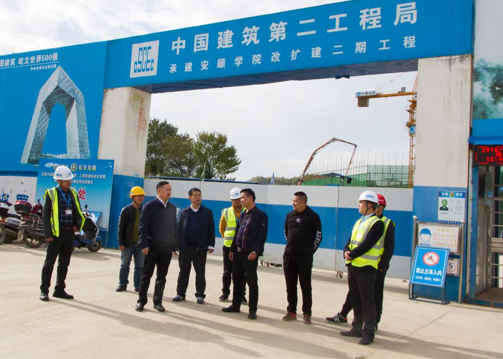 2018年11月1日下午,安顺学院校长吴次南、党委副书记陶文彩对校区改扩建工程一、二期建设项目进展情况进行调研,基建处副处长曾茂龙陪同并汇报项目进展情况。