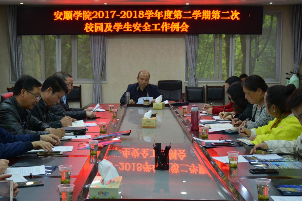 4月25日下午,安顺学院在学校行政楼二楼会议室召开会议安排部署“五一”劳动节期间校园安全稳定工作。安顺学院副院长郭本华,学生处、基建处、后勤处、团委、计算机中心、对外交流合作处、保卫处、各校属学院党总支负责人、保安公司负责人参加会议。会议由郭本华副院长主持。