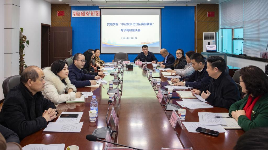 为落实教育部、省教育厅关于开展高校书记校长访企拓岗促就业专项行动的部署要求,广泛开拓就业渠道和就业岗位,深入开展社会需求调查,开展毕业生就业状况跟踪调查,3月2日下午,安顺学院党委书记罗荣彬,党委委员、副校长殷红敏率党政办、宣传部、招就处等部门及相关二级学院负责人赴安顺高新技术产业开发区开展“书记校长访企拓岗促就业”专项行动,安顺市平坝区委副书记、区直机关工委书记宋立,安顺高新区党工委常务副书记赵成龙陪同走访调研。