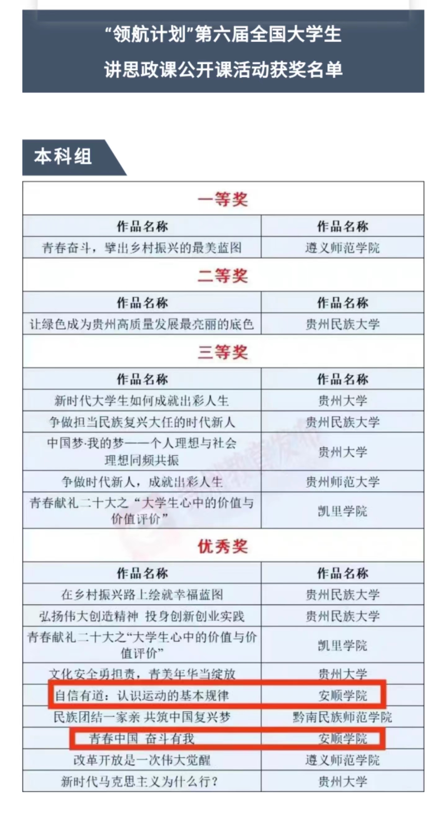为深入贯彻落实习近平总书记关于“大思政课”的重要指示批示精神,充分发挥高校思政课立德树人关键课程作用,坚持不懈用习近平新时代中国特色社会主义思想铸魂育人,引导学生深刻认识“两个确立”的决定性意义,增强“四个意识”,坚定“四个自信”,以实际行动迎接党的二十大胜利召开,教育部开展习近平新时代中国特色社会主义思想大学习领航计划主题教育活动。其中,“青春献礼二十大·强国有我新征程”——第六届全国高校大学生讲思政课公开课展示活动评选结果正在公示,其中安顺学院参评作品:《自信有道:认识运动的基本规律》《青春中国 奋斗有我》荣获优秀奖。(文/图:宣传部 杨茜)