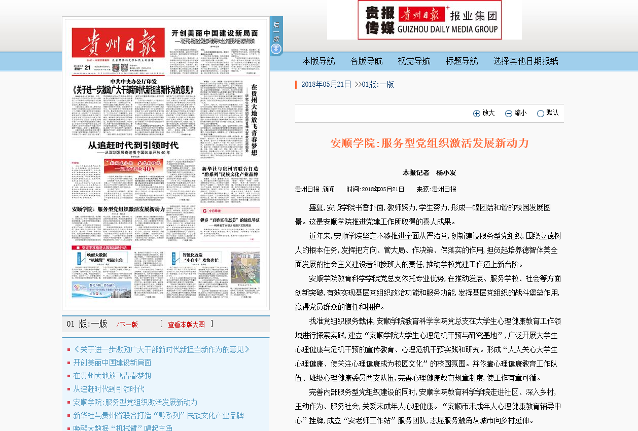 5月21日,贵州日报头版以“安顺学院:服务型党组织激活发展新动力”为题报道了我校党建工作情况。(王智勇)